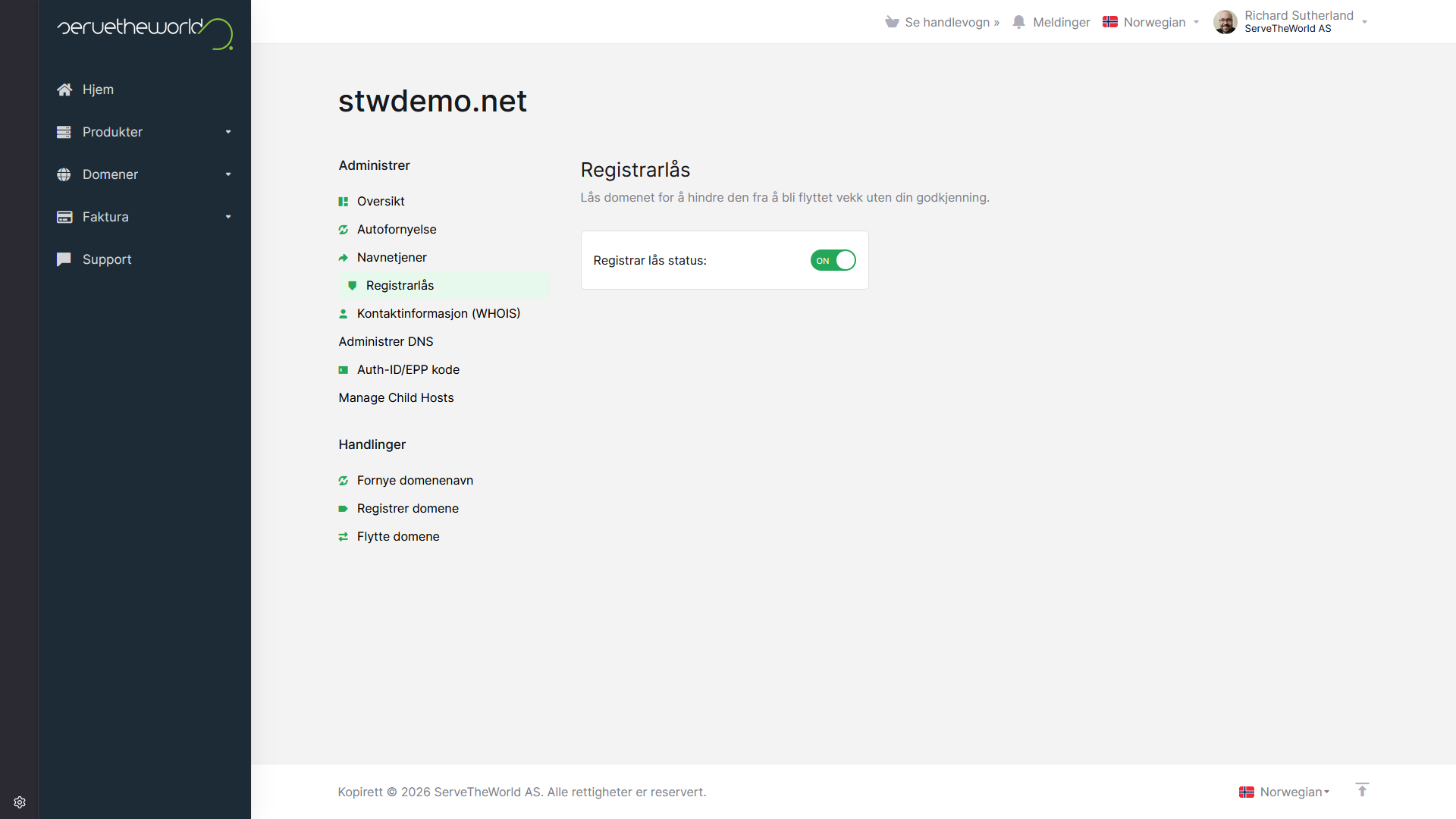 I STW-kontrollpanelet kan du administrere domenelåser under Domener → Mine domener → [ditt domene] → Registrarlås. Det er en enkel på/av-knapp som brukes til å aktivere eller deaktivere registrar-låsen.